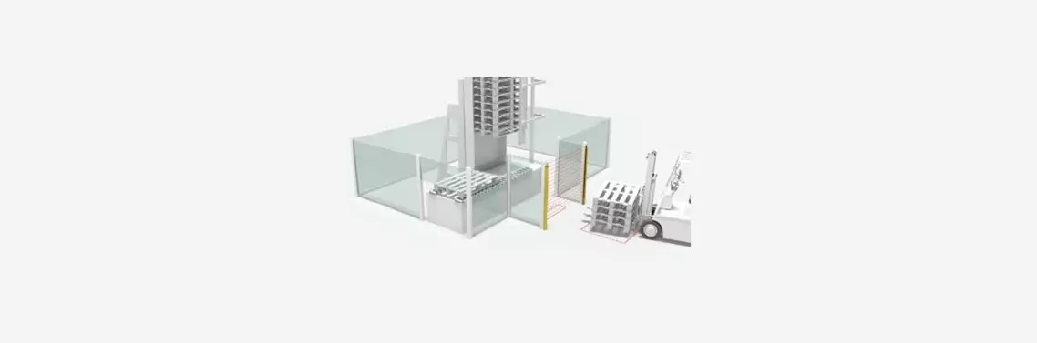 Do tej pory wiele stacji przeładunkowych z funkcją automatycznego ponownego uruchomienia było zabezpieczonych w następujący sposób: bezkontaktowe urządzenia ochronne (ESPE) zabezpieczały punkt dostępu – jeśli ESPE zostało wzbudzone, maszyna i przenośnik zostają zatrzymane. Aby uniknąć konieczności ponownego uruchomienia zatrzymanej maszyny po wykonaniu załadunku przez pojazd przeładunkowy , np. przez wózek widłowy, jako sygnały mutingu stosuje się dwie pętle indukcyjne. Są one umieszczone w posadzce przed urządzeniem ESPE. Gdy wózek widłowy przesuwa się nad pętlami indukcyjnymi, bezkontaktowe urządzenia ochronne zostają tymczasowo zmostkowane. To rozwiązanie nie odpowiada już obecnym standardom technologii bezpieczeństwa: koncepcja systemu często ograniczona jest do analizy jednokanałowej, a w rezultacie, w pewnych okolicznościach wydajność systemu bezpieczeństwa nie spełnia wymogów dla danego zastosowania. Nowy typ zabezpieczenia dostępu do magazynu palet ma na celu uniemożliwienie wejścia osób, ale jednocześnie umożliwia wprowadzenie palet za pomocą wózka widłowego.