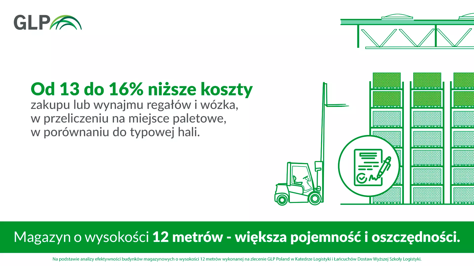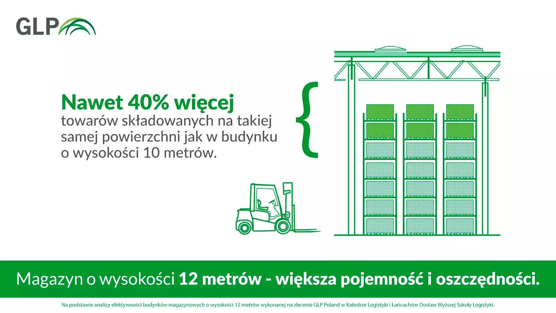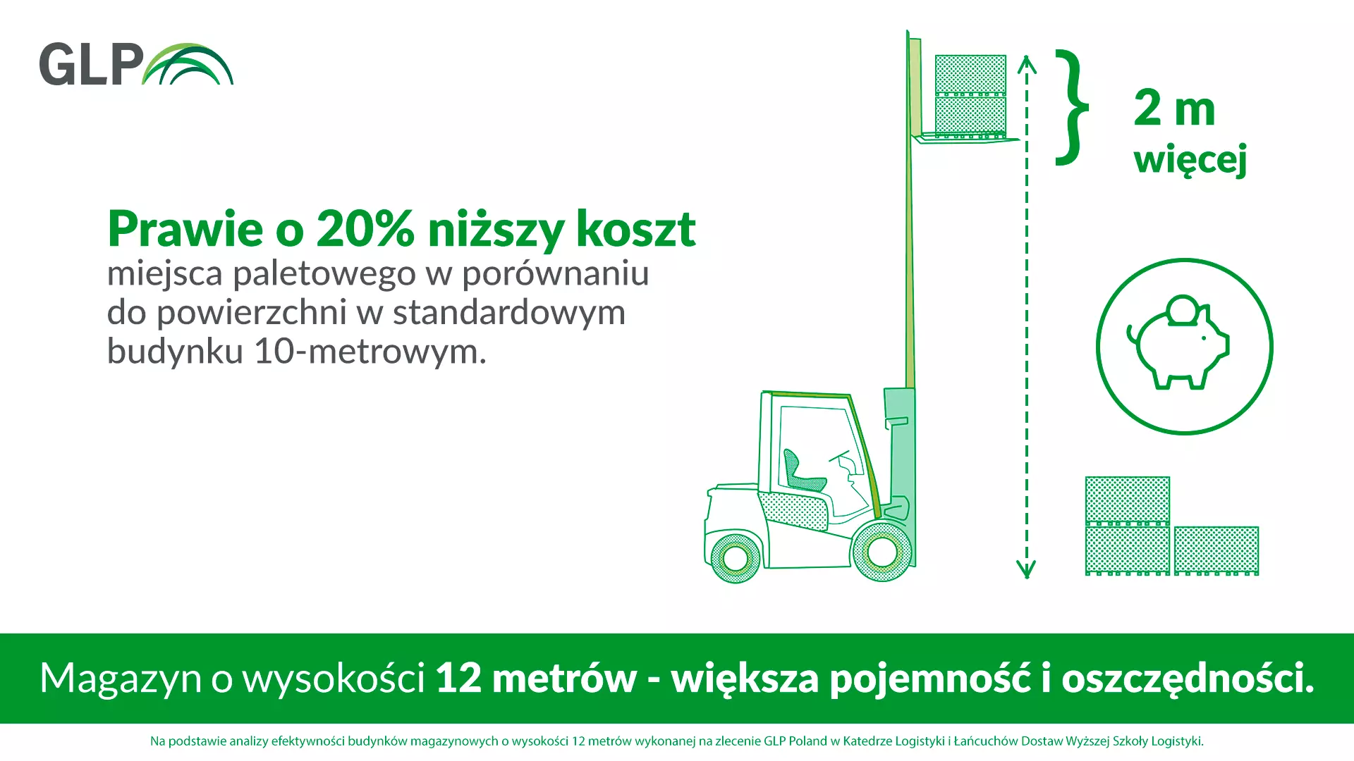 W ramach analizy wykonanej na zlecenie GLP porównane zostały możliwości wykorzystania przestrzeni magazynowej w budynkach o wysokości 10 i 12 metrów z zastosowaniem stałych regałów ramowych bezpółkowych, z gniazdami o pojemności 3 palet EUR (do 1 tony każda) i wysokości palet z ładunkiem w zakresie od 1410 mm do 1750 mm. Dla celów porównawczych przyjęto moduł budowlany o rozstawie słupów 12 m x 24 m, a w każdym takim module przewidziano dwa rzędy regałów pojedynczych i trzy rzędy regałów podwójnych. Autorzy porównali też koszty związane z eksploatacją jednego miejsca paletowego, w tym koszty zakupu lub wynajmu sprzętu niezbędnego do jego obsługi – regałów i wózka podnośnikowego z wysuwanym masztem o odpowiedniej wysokości podnoszenia. W badaniu oczywiście wzięto pod uwagę instalacje znajdujące się w typowej hali: oświetlenie, wentylację, ogrzewanie i zabezpieczenia przeciwpożarowe (w magazynach GLP wykonywane jest ono zgodnie z amerykańską normą NFPA), a także nośność posadzki.