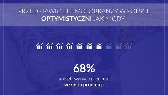 Przedstawiciele motobranży w Polsce z optymizmem patrzą w przyszłość. 2 na 3 z nich oczekuje, że produkcja w ich zakładach będzie rosnąć. W tym roku mamy niemal dwa razy więcej produkcyjnych optymistów niż w 2017 r. (wzrost o 32 p.p.).